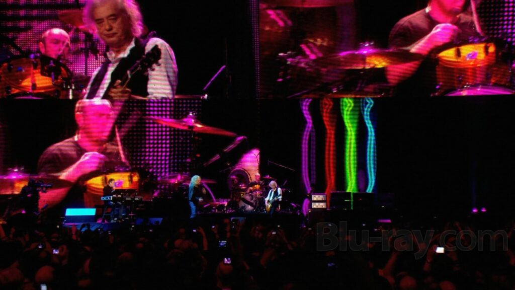 The Blu-ray release of Led Zeppelin’s “Celebration Day,” presented by Warner Music, features an AVC-encoded 1080p transfer in a 1.78:1 aspect ratio. Director David Carruthers captured the performance using an impressive array of cameras from diverse perspectives, enhancing the visuals with added grain and various effects applied to some of the footage.